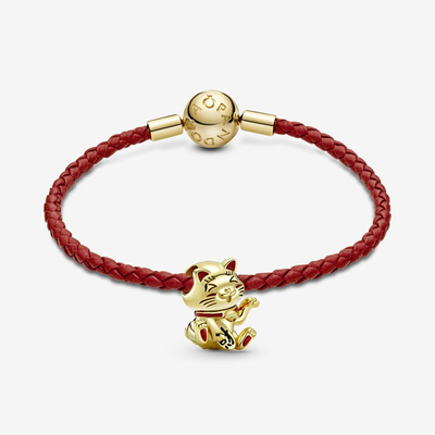 Bộ quà Tặng 2 món, 14k Gold-Plated, Pandora moments Vòng tay da khóa tròn và charm hình mèo may mắn
